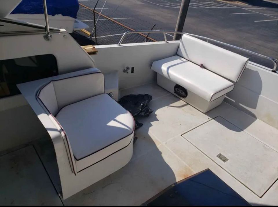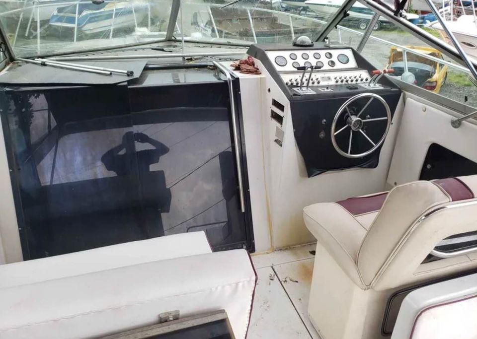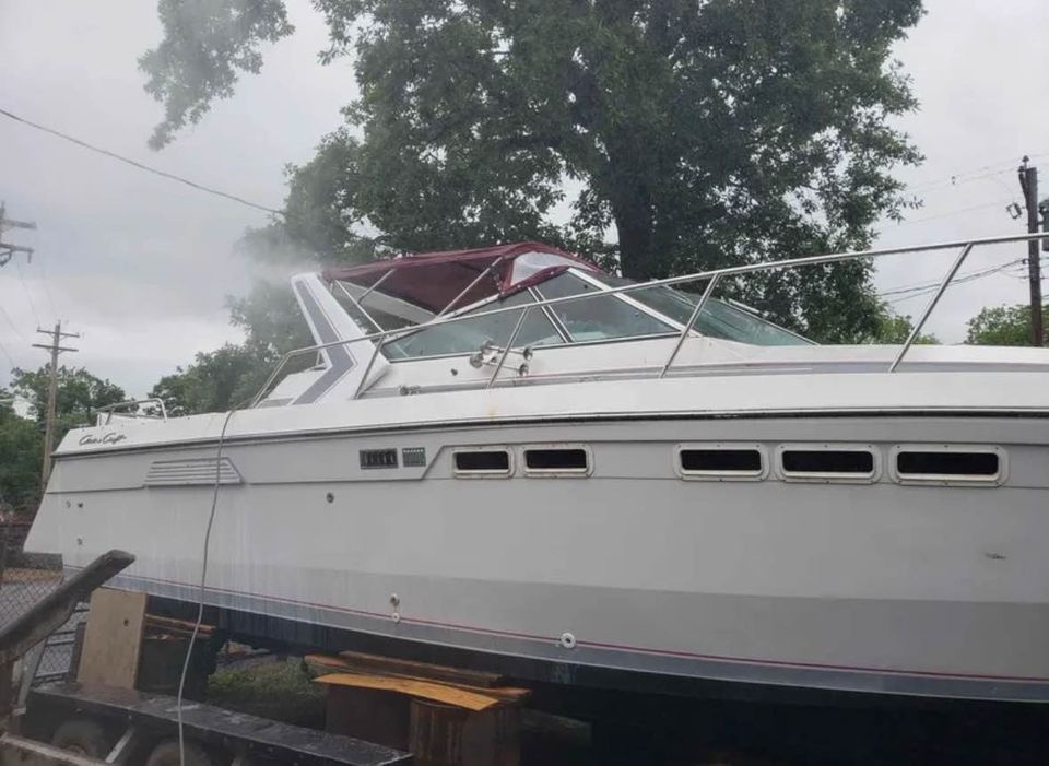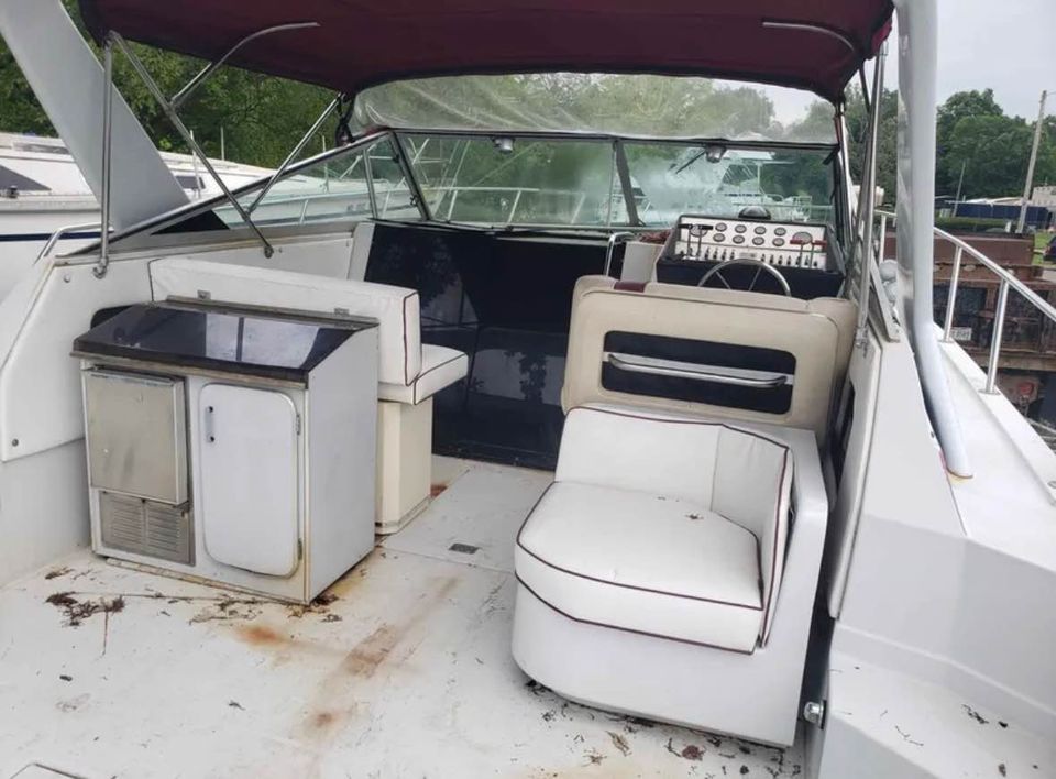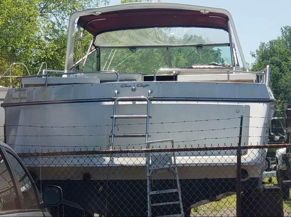 This Classc Chris Craft boat has has a ton of potential and here’s your chance to own a 33 ft Cabin cruiser. This large express cruiser is powered by a pair of 7.4L inboards and a generator. This boat has been in storage for sometime and needs attention. It was winterized before it was stored. Both motors turn over. Unsure about generator but assume it should work. 33 ft length and 12 ft 1 in Beam. 11,560 lbs. The mattress in the V Berth needs a new cover. The boat is presently stored on drums and blocks and has been shrinkwrapped. It’s sold “as is”. Storage is available. There is no trailer. It can be moved by a professional boat mover or launched from the marina once the boat is up and running. Will consider reasonable (not lowball) offers. We have the original sales brochure for the boat as well.