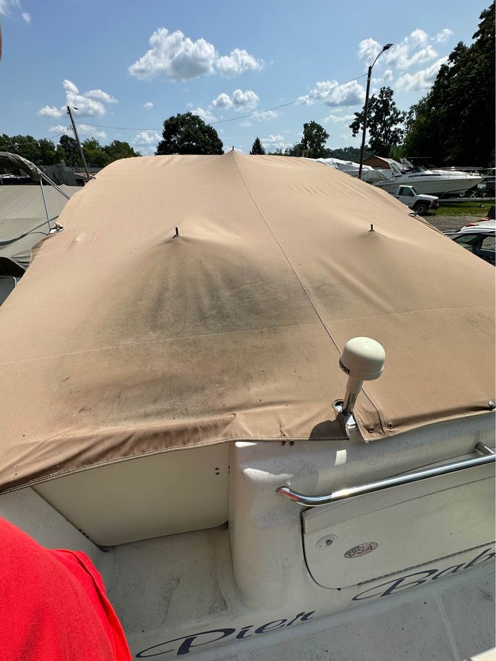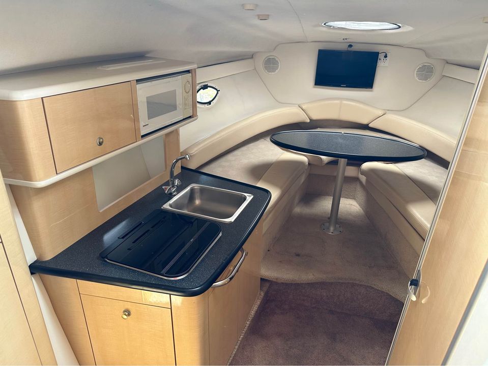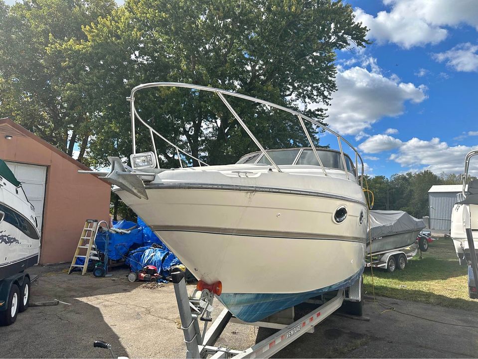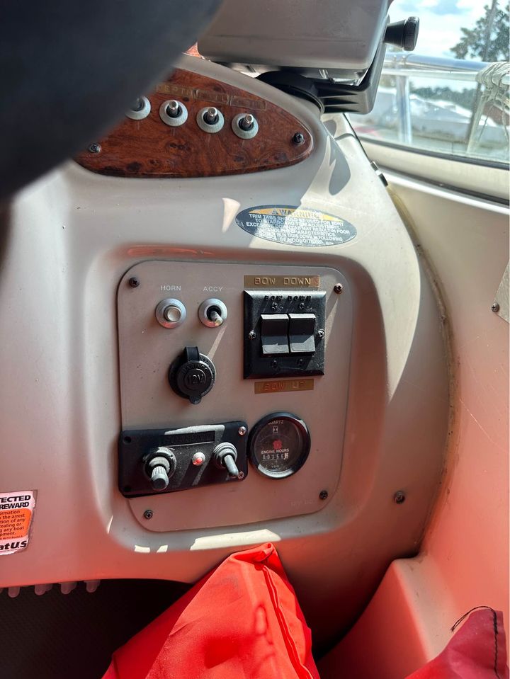 Cruiser with aft cabin. Powered by 7.4L MPI Mercruiser with Bravo 3 outdrive. Only 285 hours. New marine A/C with reverse heat. This is 9ft 6in wide so it feels roomier than most 27 ft boats with 8ft 6in widths. Nice comfortable cockpit area. Cabin has an alcohol/electric stove, microwave and freshwater system. Bathroom has a head, sink and shower. Macerator. V Berth functions as a dining area and converts to a bed. Good sized aft cabin. Cockpit cover and full winter storage cover. No Bimini or camper tops.