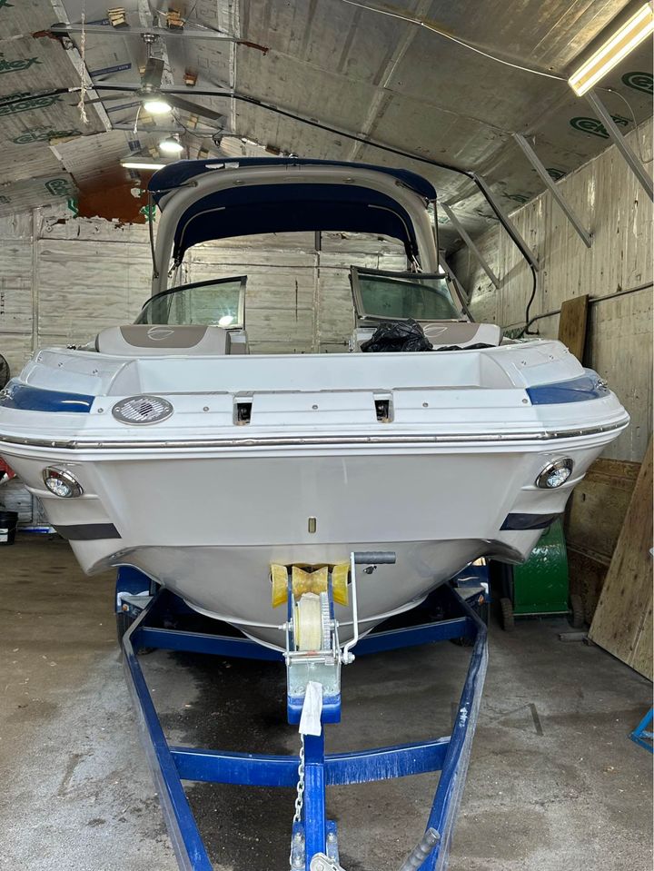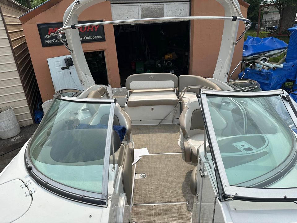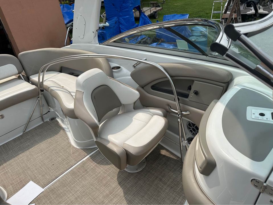 Luxurious 25 1/2 ft Deckboat loaded with options: 6.2L 300 hp Mercruiser with Bravo 3 outdrive, 421 hours, radar arch, woven vinyl carpet, SeaDeck carpet on swim platform and bow boarding area, step down bathroom with Vacuflush head and sink with granite counter, rear wash down, comfortable and relaxing seating, motorized transom seat back that holds position whether it’s in the sun pad or upright or anywhere in between. Front and rear boarding ladders, lots of storage, great sounding Bluetooth stereo with rear facing wet sounds speakers. Bimini top and bow and cockpit covers. Table that stows in a built in drawer in center storage area. Built in battery charger.